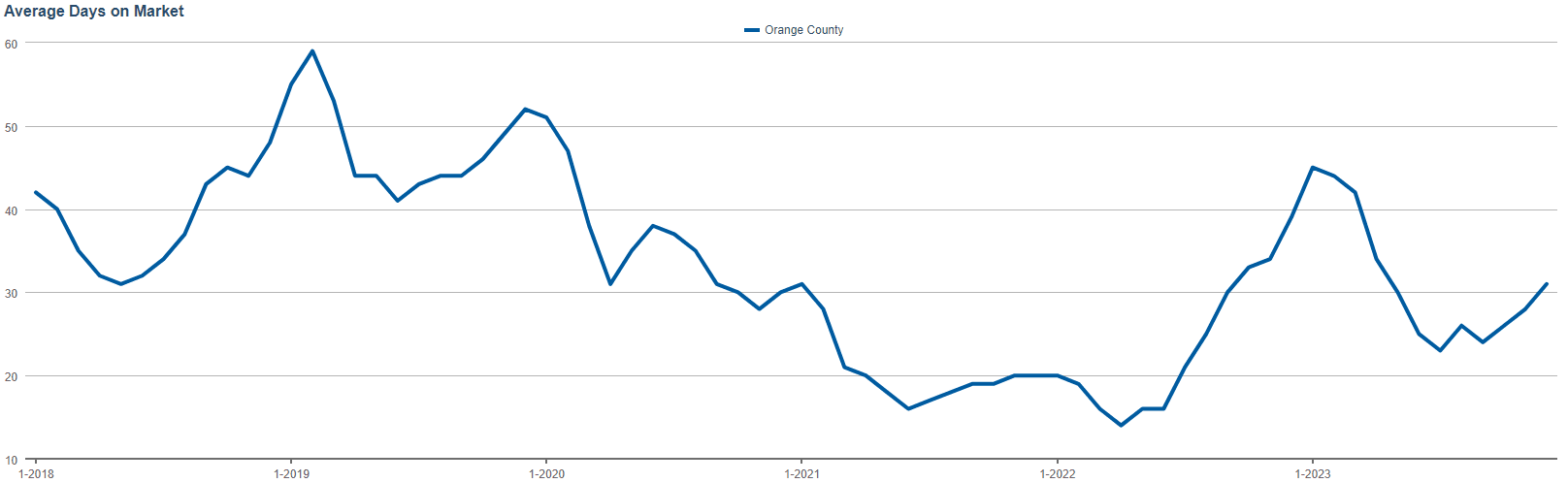 The average days on the market for properties in December 2023 was 31. This relatively brief period reflects the high demand for properties in Orange County and the swift pace at which transactions are being completed.