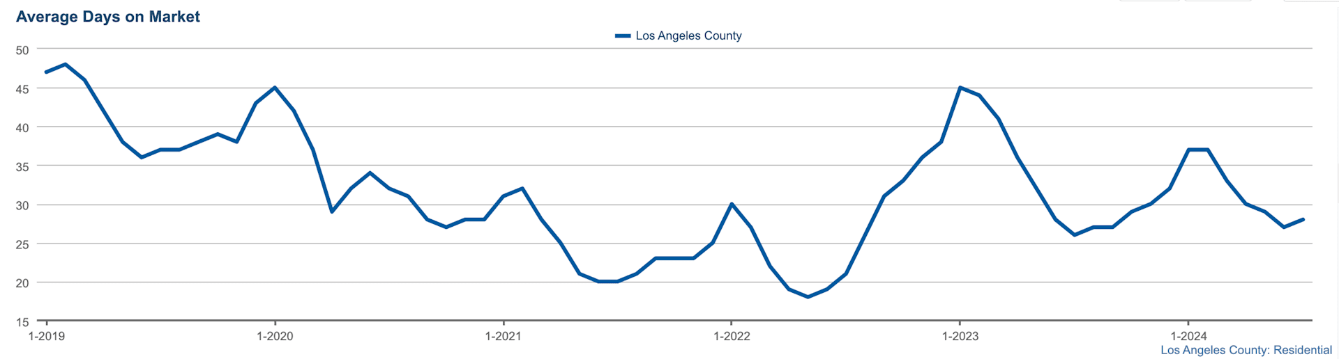 Homes in Los Angeles County spent an average of 28 days on the market before selling. While this is slightly longer compared to previous months, it still indicates a relatively swift turnover, especially given the increased inventory.