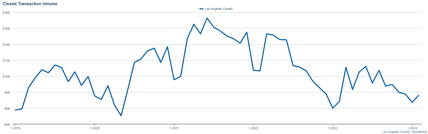 The closed transaction volume for the month was a staggering $7,606,422,642. This significant figure underscores the substantial value being exchanged in the Los Angeles County real estate market, reflecting the high level of investment activity in the area.