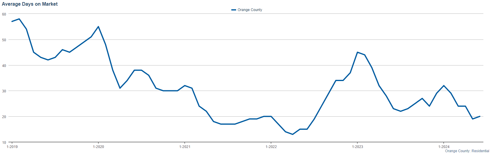 Properties in Orange County spent an average of just 20 days on the market before being sold. This quick turnover rate reflects high demand and a competitive market environment where homes are quickly snapped up by eager buyers.