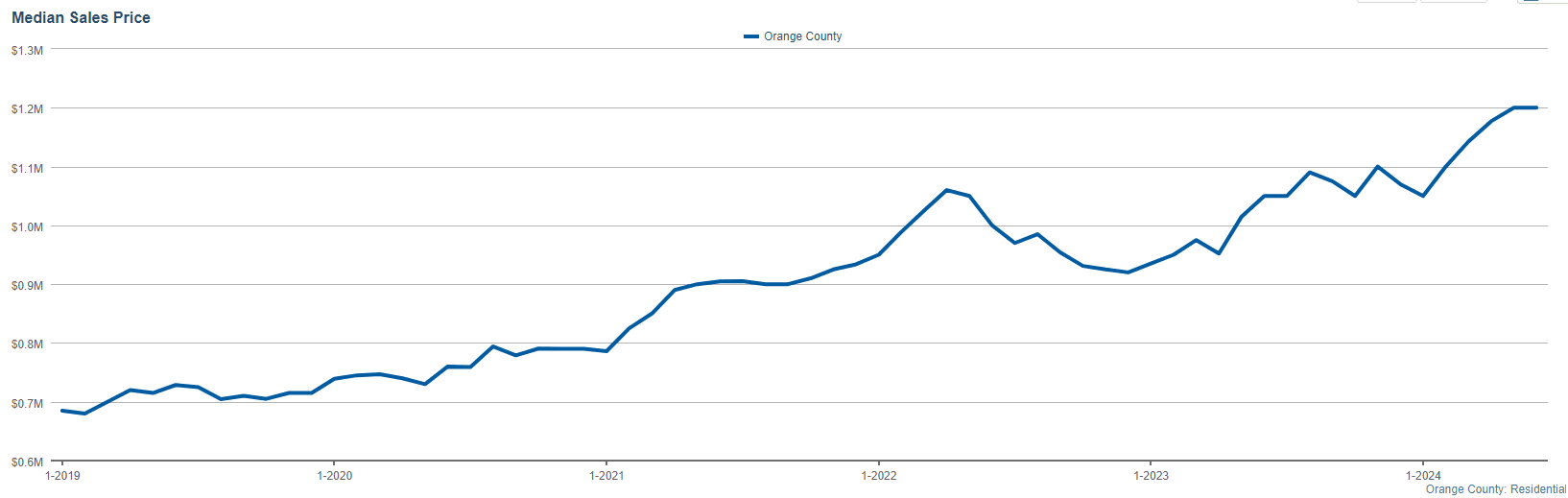 In June 2024, the median sales price in Orange County rose to $1,200,000, marking a notable increase in property values. This median price point serves as a key indicator of the market's health and attractiveness, appealing to buyers looking for premium properties in an upscale region.