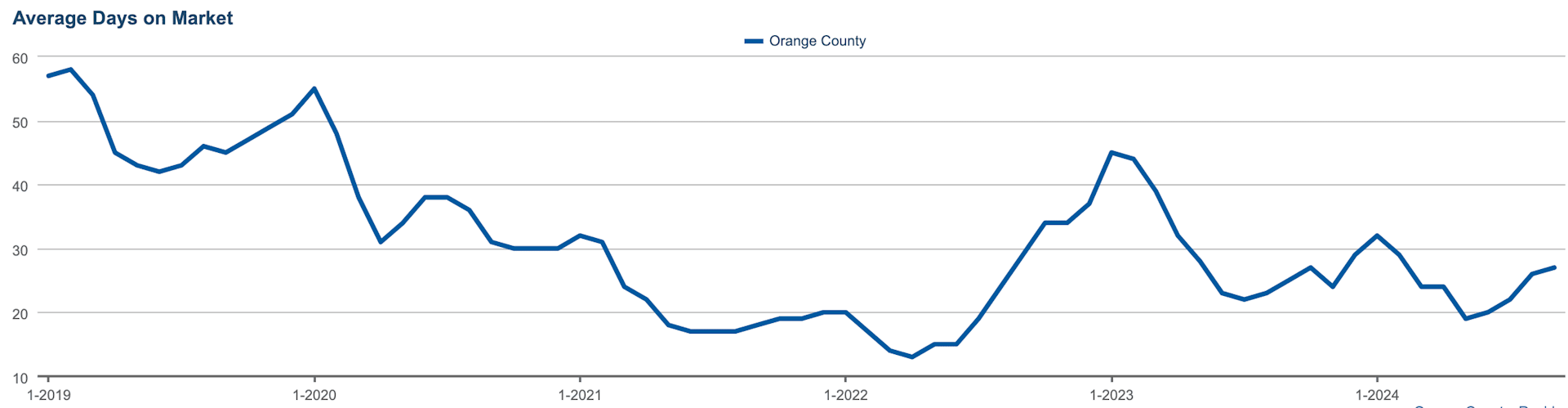 Properties in Orange County spent an average of 27 days on the market before being sold. This slightly longer timeframe compared to previous months suggests a shift towards a more balanced market, where buyers have a bit more time to make informed decisions while sellers adjust their strategies to attract prospective buyers.