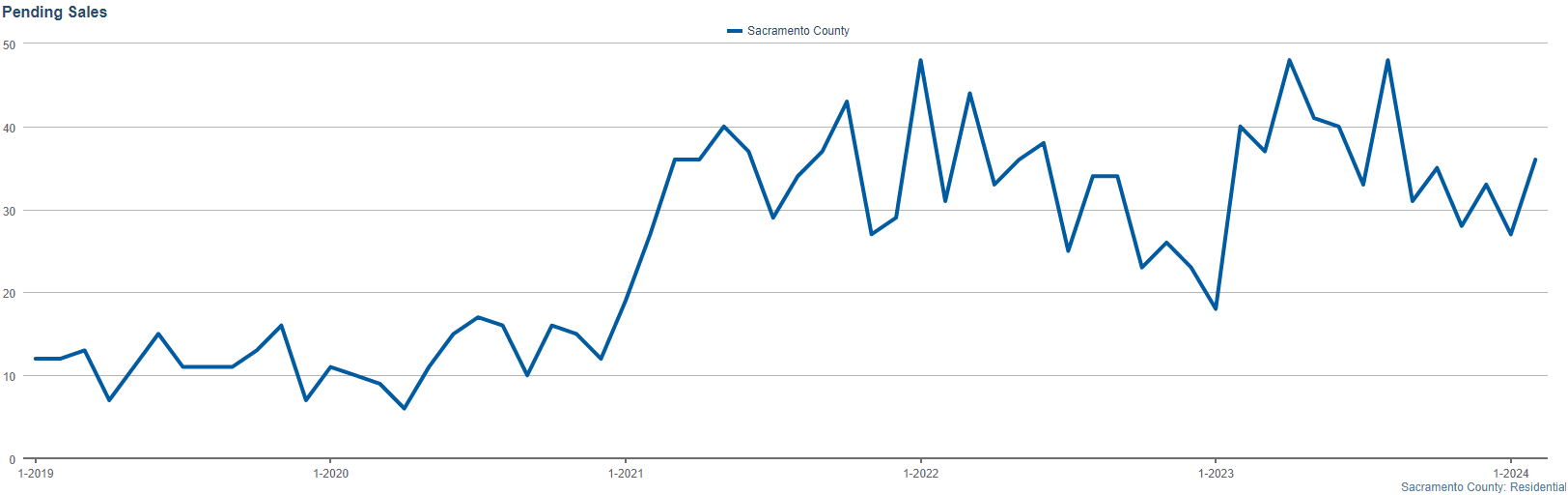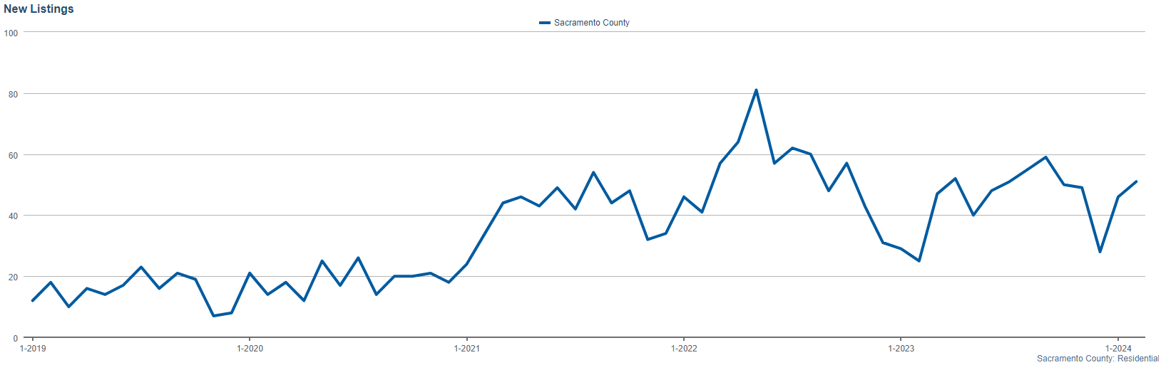 February 2024 saw a total of 51 new listings in Sacramento County. This figure indicates a steady stream of sellers entering the market and presents potential buyers with fresh options, spanning from cozy single-family homes to multi-unit investment properties.