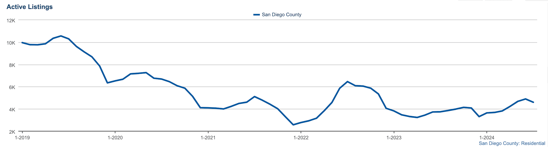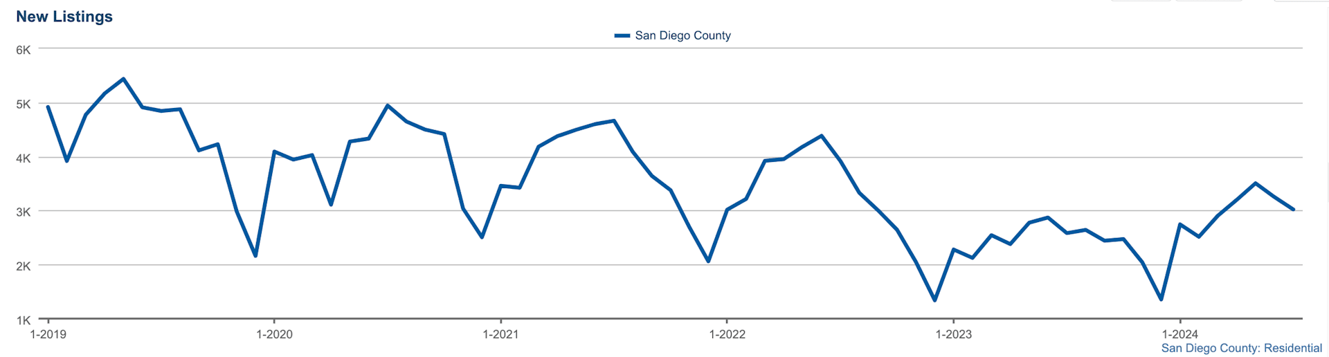 In July, San Diego County saw 3,020 new listings, boosting the total number of active listings to 4,602. This increase in inventory provides more choices for buyers and may contribute to a more balanced market compared to the high competition seen earlier in the year.