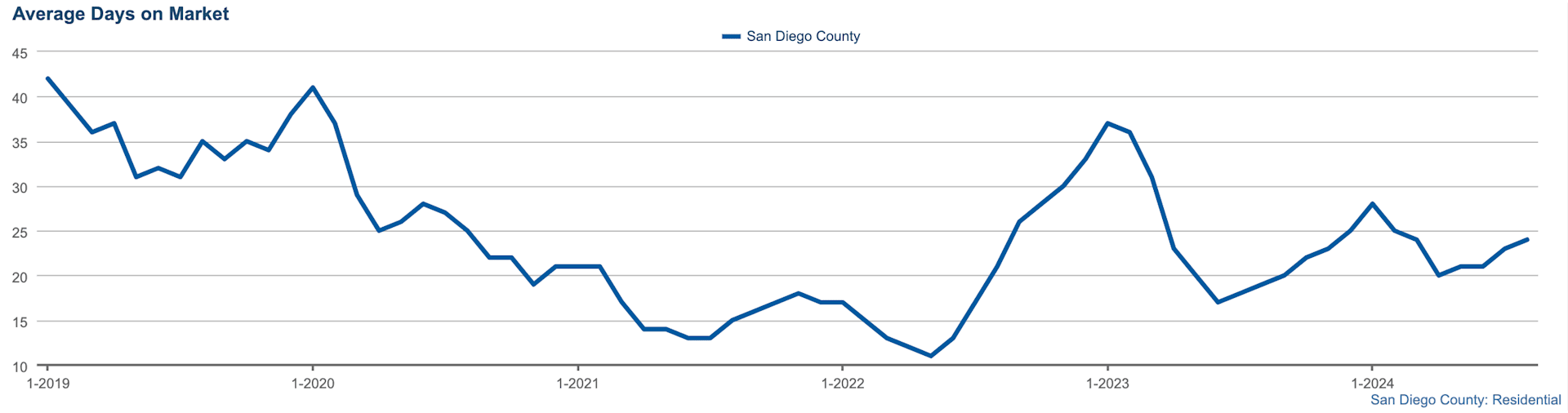 Properties in San Diego County spent an average of 24 days on the market before being sold. This moderate timeframe indicates a balanced market where homes are selling at a steady pace. While properties are selling relatively quickly, the average days on market suggest that buyers still have sufficient time to carefully consider their options, which is advantageous for both buyers and sellers in maintaining fair market negotiations.