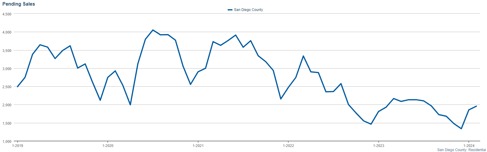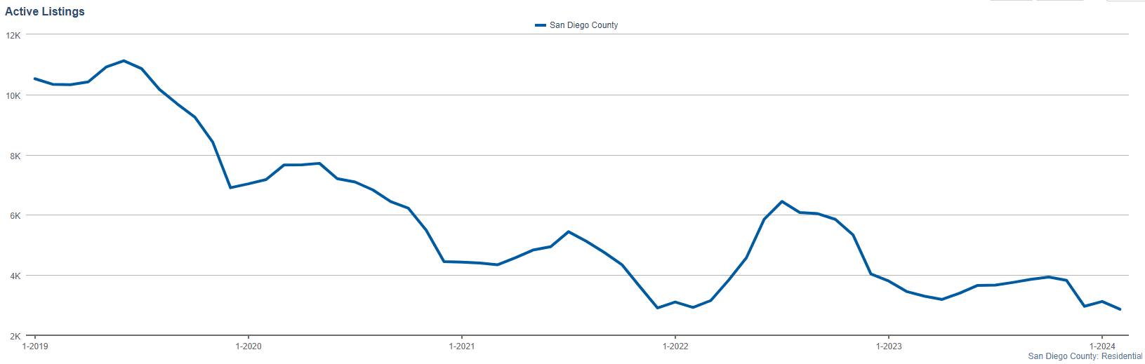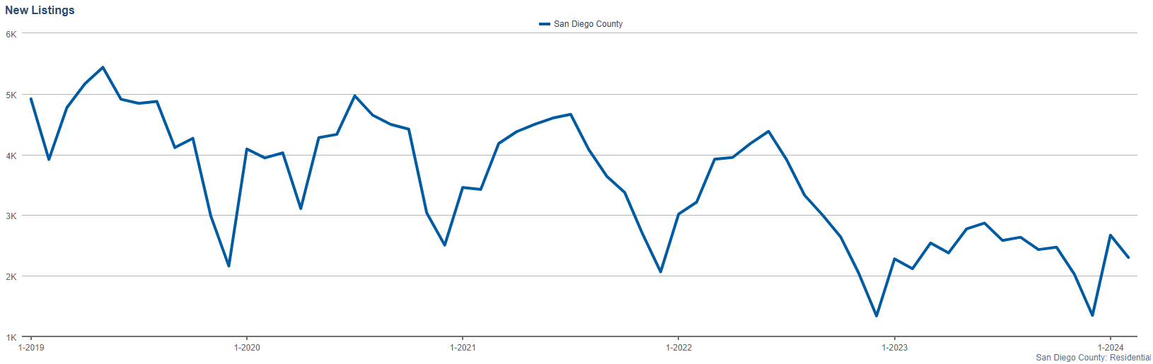 In February 2024, San Diego County saw a total of 2,302 new listings. This figure shows an active seller market that presents potential buyers with fresh property options – from beachfront condos to spacious family homes.
