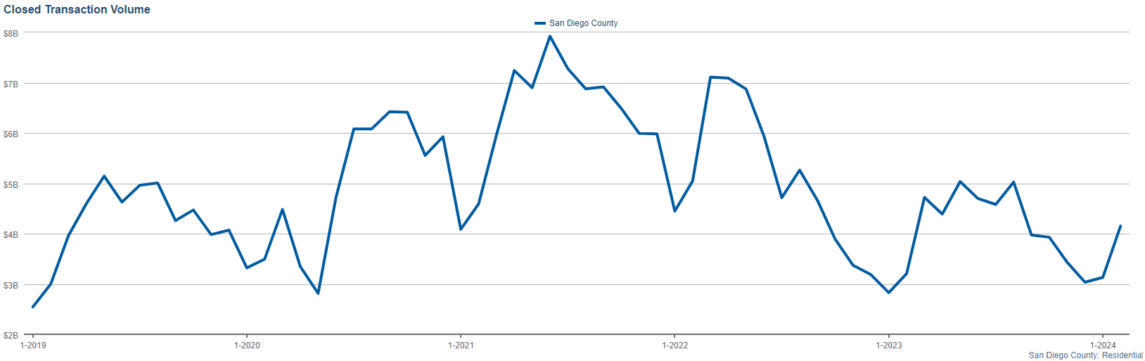 The closed transaction volume for the month was a remarkable $4,151,039,966. This figure underscores the substantial value being exchanged in the San Diego County real estate market, reflecting high levels of investment activity in the area.
