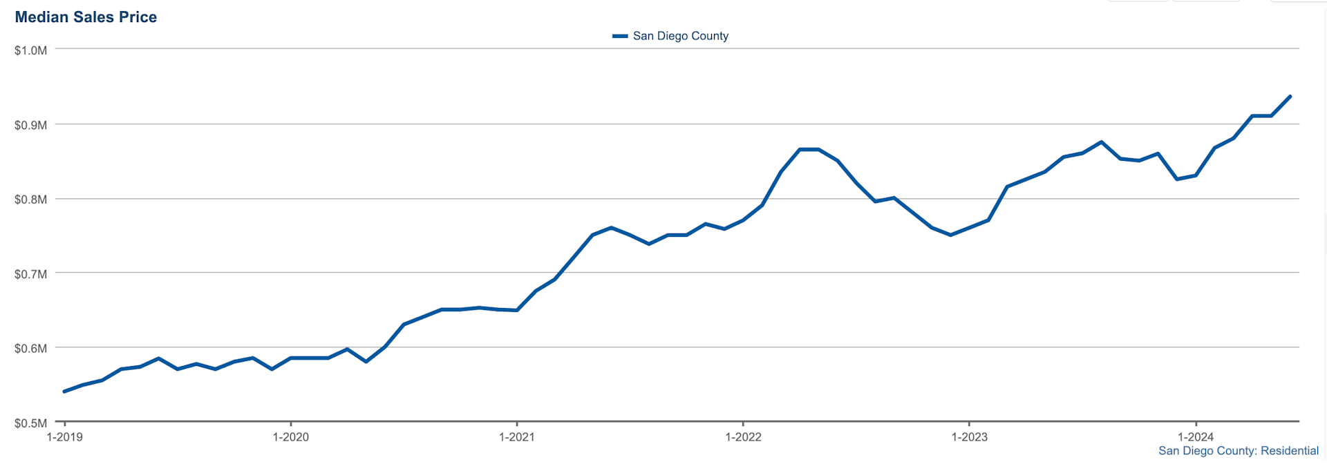 The median sales price in San Diego County for June 2024 was $936,000. This reflects the ongoing trend of rising home prices in the area, driven by high demand and limited supply.
