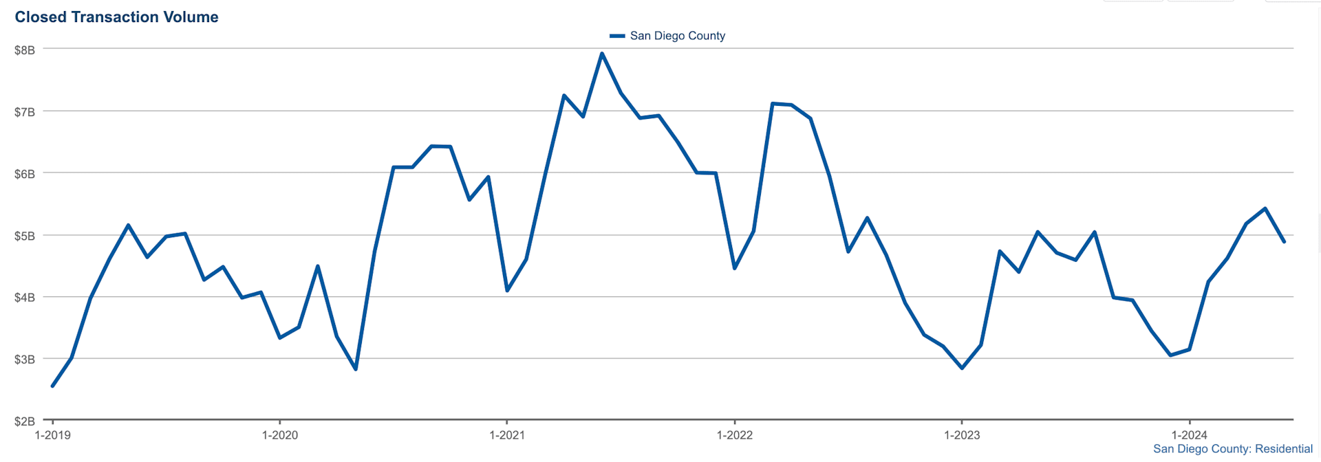 The closed transaction volume for June 2024 was an impressive $4,878,488,520. This substantial volume highlights the robust nature of the San Diego County real estate market, driven by high-value transactions.