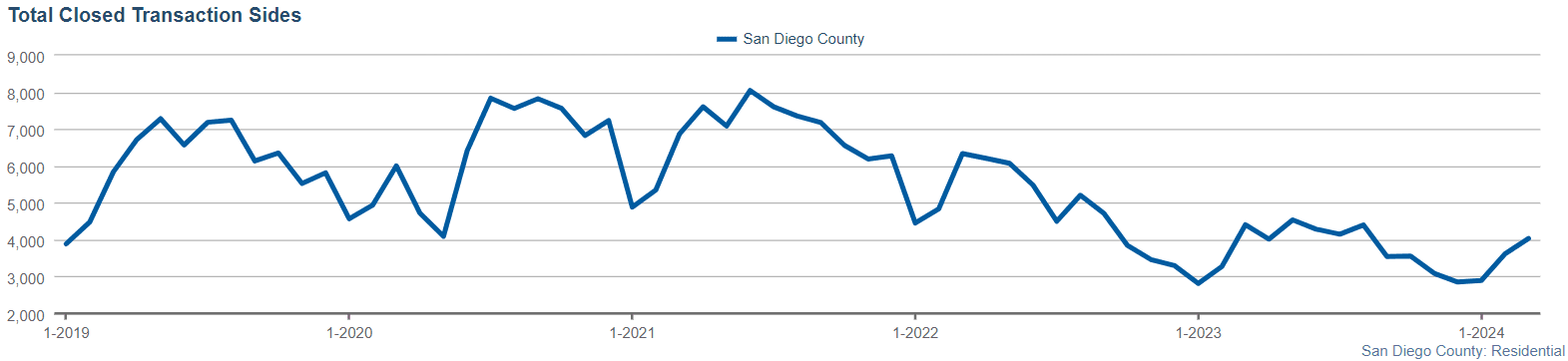 The total transaction volume for closed sales reached 4,034.0, reflecting the substantial value exchanged within the San Diego County real estate market. This figure underscores the economic activity and investment value present in the region, making it an attractive destination for buyers and investors alike.